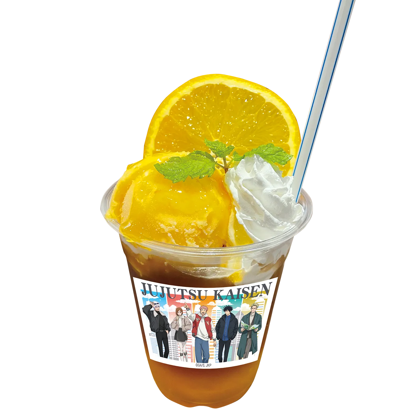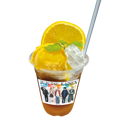 オレンジソース、氷、アイスティー、シュガーシロップ、オレンジジュース、ホイップクリーム、オレンジスライス、オレンジソルベ、ミント