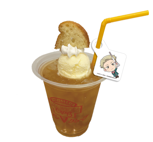 ホイップクリーム、ミックスフルーツ、バニラアイスクリーム、エメラルドグリーンゼリー、ホワイトチョコレート+可食フィルム、オレンジソース、コーンフレーク